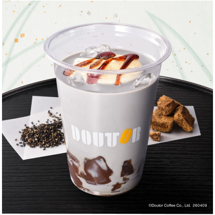 濃厚で香ばしい味わいの黒ごまオレに、さらに黒糖わらびもちと国産丹波黒豆のきなこをトッピングすることで、食感と濃厚感をプラス。