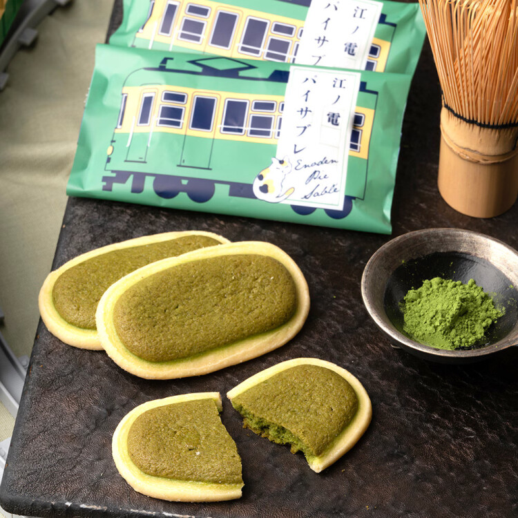 江ノ電カラーをイメージした抹茶サブレ。オリジナル抹茶を使用したサブレ生地をパイ生地で包み、サプリにも使われるイチョウ葉エキスを配合。上品な抹茶の風味と、パイ生地の絶妙な塩味が調和した、どこか懐かしく身体に優しい味わいです。5個入の箱は、江ノ電の車両の形です。
